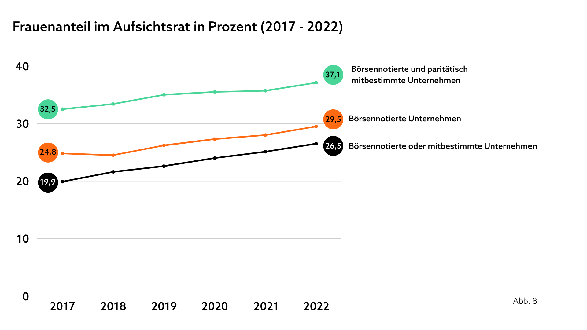 In börsennotierten Unternehmen lag der Anteil von Frauen in Aufsichtsräten im Geschäftsjahr 2022 bei 29,5 Prozent, bei börsennotierten oder mitbestimmten Unternehmen bei 26,5 Prozent.10, 11, 12