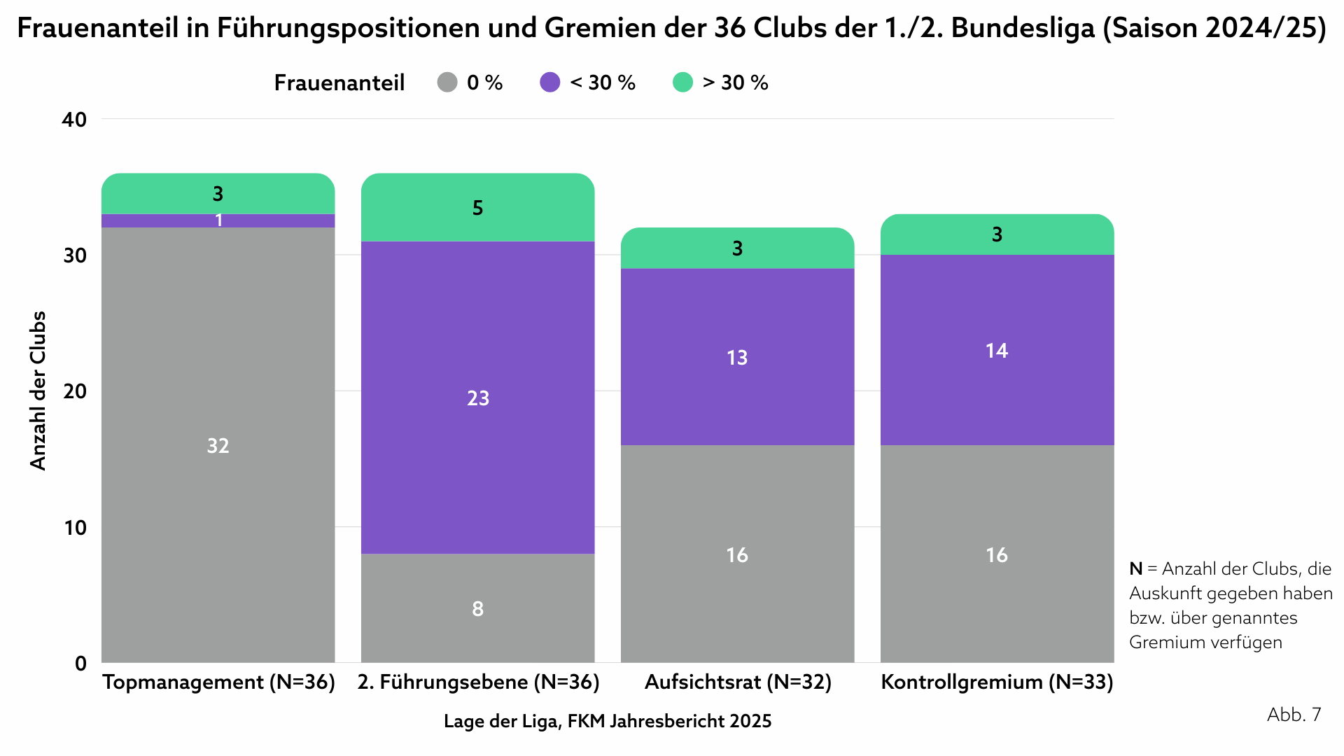 Zum Zeitpunkt der Erhebung hatten drei der 36 Clubs einen Frauenanteil von mehr als 30 Prozent im Topmanagement, ein Club lag unter der