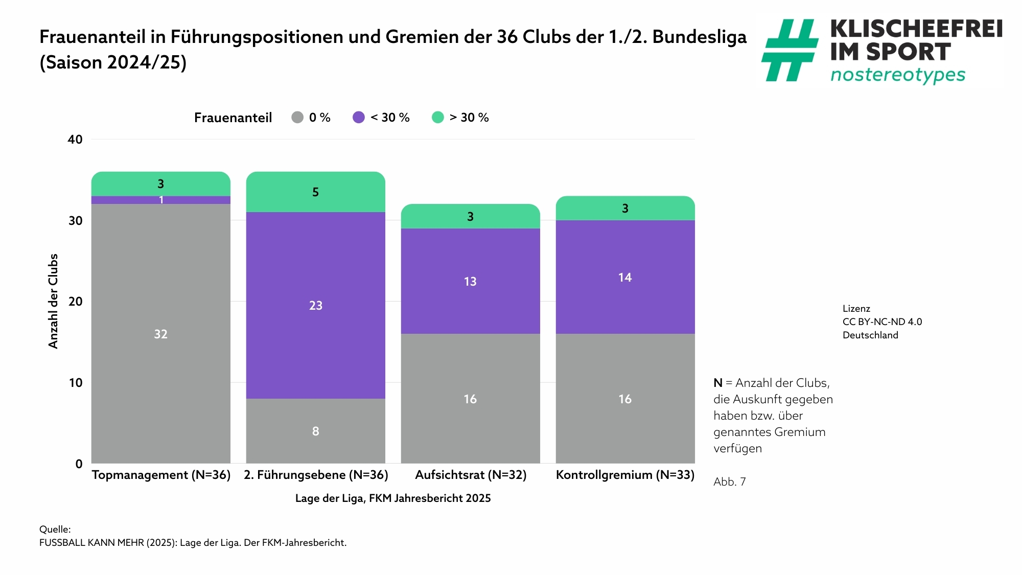 23 Clubs liegen unter der 30-Prozent-Marke. In Bezug auf die Aufsichtsräte und Kontrollgremien (Anm.: In vielen Fällen sind Aufsichtsräte die Kontrollgremien) meldeten jeweils rund die Hälfte der Clubs zurück, dass keine Frau im Gremium vertreten ist.6